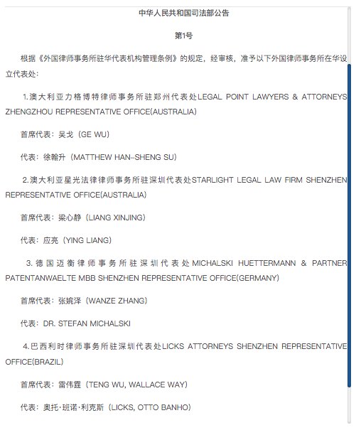 此次落户深圳的外国律所驻华代表处,分别是巴西利时律师事务所驻深圳代表处、澳大利亚星光律师事务所驻深圳代表处、德国迈衡律师事务所驻深圳代表处,以及从北京迁入深圳的德国泰乐信律师事务所驻深圳代表处。