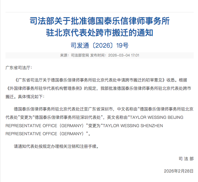 3月4日,司法部发布2026年第1号公告,宣布新批准4家外国律师事务所在华设立代表处,其中3家落户深圳。记者留意到,司法部同时批准了一家德国律师事务所将其驻华代表处从北京搬迁至深圳。